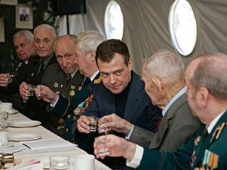 Медведев выпил с ветеранами сто грамм, посетовал на дороговизну гречки и рассказал про государство-"тряпку"После встречи с представителями военно-патриотических организаций в воскресенье в Москве Медведев присел за один из столов полевой кухни и выпил фронтовые сто грамм. "Спасибо большое за Победу! С наступающим самым великим праздником", - сказал президент. Ветераны трижды прокричали "Ура". Медведеву пришлось по вкусу фронтовое угощение. "Каша вкусная", - отметил он, попробовав гречневую кашу. В ответ один из ветеранов сказал: "Гречка нынче дорогая, по 120 рублей за килограмм". "Гречка дорога, это правда", - согласился президент. Медведев также расписался в Книге почетных гостей музея и получил от ветеранов символ Победы - статуэтку "Родина-Мать". "Мы победили, потому что были сильными, и правым было дело нашего народа", - сказал президент. Просмотров: 1446