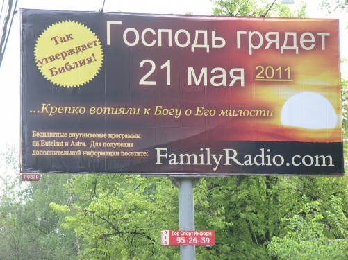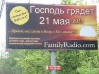 В Рязани появились плакаты, призывающие готовиться к концу светаПлакаты являются рекламой радиоканала, основателем которого является Гарольд Кемпинг, известный проповедник США. Недавно в Рязани появились рекламные баннеры, сообщающие о том, что конец света наступит 21 мая 2011 года. Причем особо отмечается, что "так утверждает Библия".Плакаты являются рекламой радиоканала, основателем которого является Гарольд Кемпинг, известный проповедник США, который отличился не только своим предсказанием конца света, но и яростными нападками на Церковь. В Библии четко сказано: "О дне же том, или часе, никто не знает, ни Ангелы небесные, ни Сын, но только Отец" (Мк. 13:32). Поэтому все попытки указать точное время конца времен является заведомо обреченным на неудачу делом. Подобная тенденция (указание точной даты конца времен) является выражением сектантского мировоззрения и не может быть примлема православному христианину. Безусловно каждый верующий должен готовиться ко встрече с Господом, но подготовка эта должна быть духовной. Историческая справка: В 1942 году Герольд Кемпинг получил степень бакалавра по гражданскому строительству в Калифорнийском университете. В 1953 году он приобрел строительную фирму «Плимут констракшен» и переименовал ее в «Кемпинг констракшен». Постепенно эта фирма «превратилась в крупную компанию, которая, помимо прочих объектов, занималась строительством церквей по всей стране. Однако Кемпинг всегда мечтал заниматься благовестием и в 1958 году на средства, вырученные от процветающего бизнеса и удачных вложений в недвижимость, воплотил свою мечту в Семейном радио». Радиовещательная сеть, получившая официальное название Family Stations Inc., начала действовать в 1958 году. Ее цель была заявлена недвусмысленно: возвещать миру xристианское Евангелие. Сам Кемпинг занимает посты президента и генерального менеджера, но делает это безвозмездно, не получая зарплаты или иного материального вознаграждения. Ежедневная сетка вещания Семейного радио включает в себя спектр регулярных программ — например, «Моменты творения» (Creation Moments) и «Позитивное воспитание детей» (Positive Parenting). Музыкальное сопровождение выдержано в традиционном, консервативном духе. При Семейном радио существует и Библейская школа, в которой учатся более 30 тыс. студентов, по окончании получающих диплом младшего специалиста (associate). Выступления самого Кемпинга можно слышать четырежды в день с понедельника по пятницу — трижды в программе «Семейное изучение Библии» (Family Bible Study) и один раз в «Открытом форуме» (Open Forum), полуторачасовой программе, в которой он в прямом эфире отвечает на вопросы слушателей. Где-то в 1962 году Кемпинг заговорил о новых, им самим высчитанных датах сотворения мира и прочих библейских событий. Из-за того, что он предсказал конец света в 1994 году, в мае 1988 ему запретили учить в Христианской реформатской церкви. Покинув церковь, Кемпинг основал Библейское братство Аламеды (Alameda Bible Fellowship). В 1994 году он выпустил в свет книгу "1994?", в которой утверждал, что последнее время скорби началось в 1988 году и продлится 23 года (т. е. закончится в 2011 году). В этот период, по его словам, в Церкви будет владычествовать сатана, который введет новые, «вдохновленные сатаной евангелия» и будет «удерживать… сердца неверующих». Это приведет к тому, что с каждым годом будет спаса